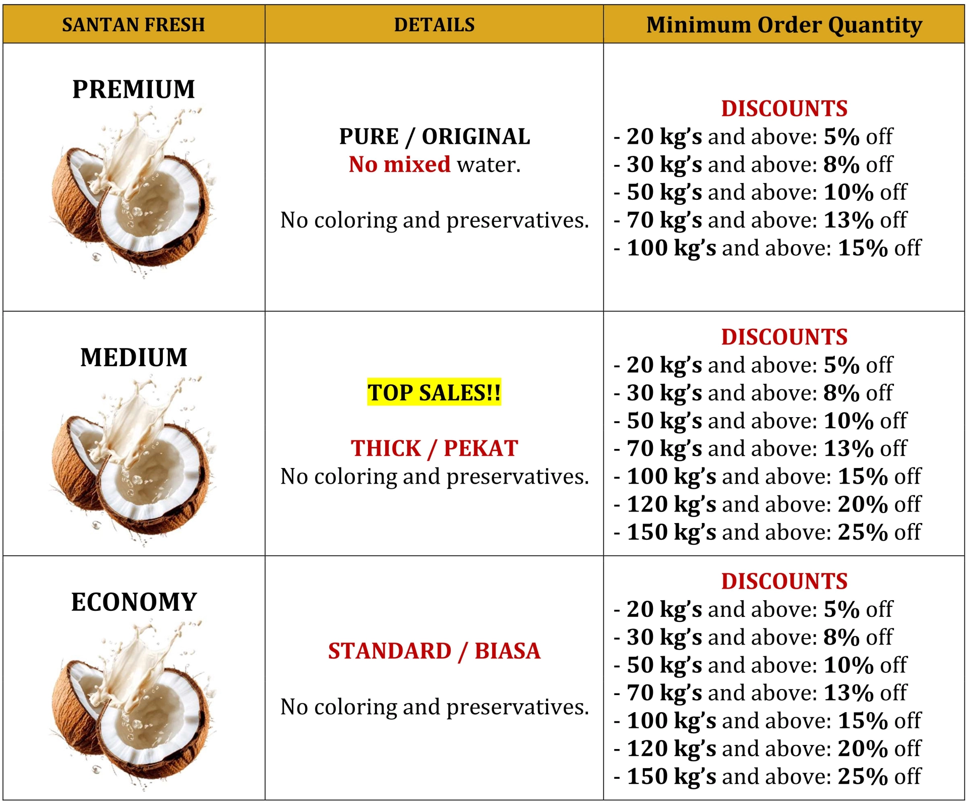 SANTAN GOLD | Jenama PENGELUAR & PEMBEKAL SANTAN SEGAR khususnya kepada majlis kenduri, katering, restoran atau kafe yang menggunakan santan segar sebagai bahan utama resipi makanan.